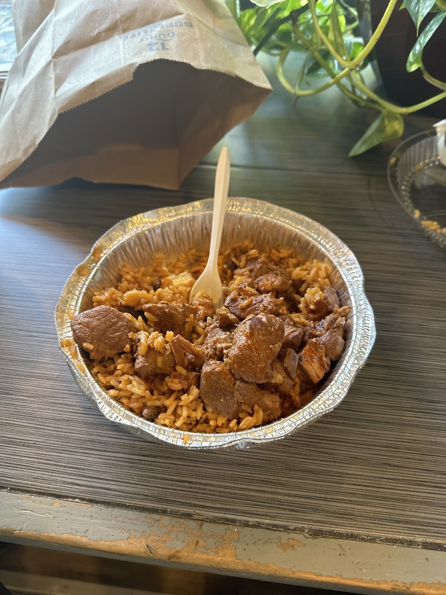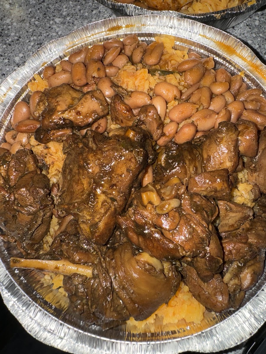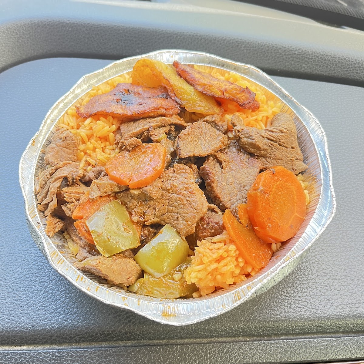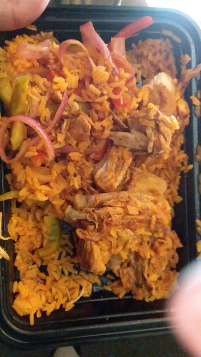 Stew chicken and yellow rice. Amazing place. Service is excellent. Feelings so satisfying when I arrive. Clean as ever. Join me and head over for a small at 5.50 large 7.50 XL 10-11 dollars that's not bad !!!!!!